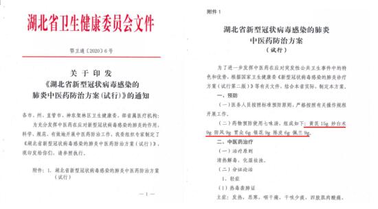 为应对严峻疫情,湖北省卫生健康委员会发布了湖北省新型冠状病毒感染的肺炎中医药防治方案(试行)。其中药物预防方案推荐使用七味汤;治疗以“清热解毒、化湿祛浊”为原则分证论治。